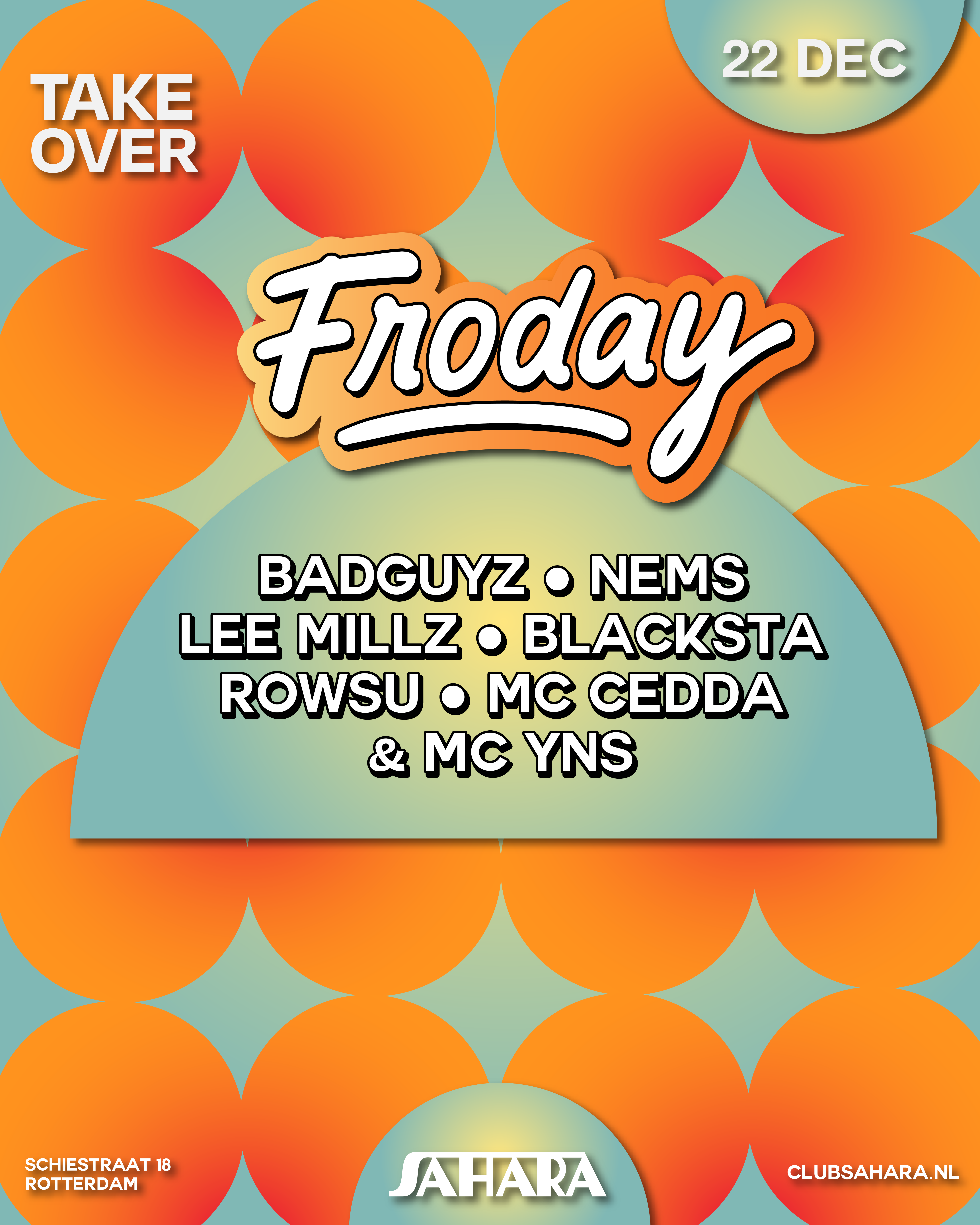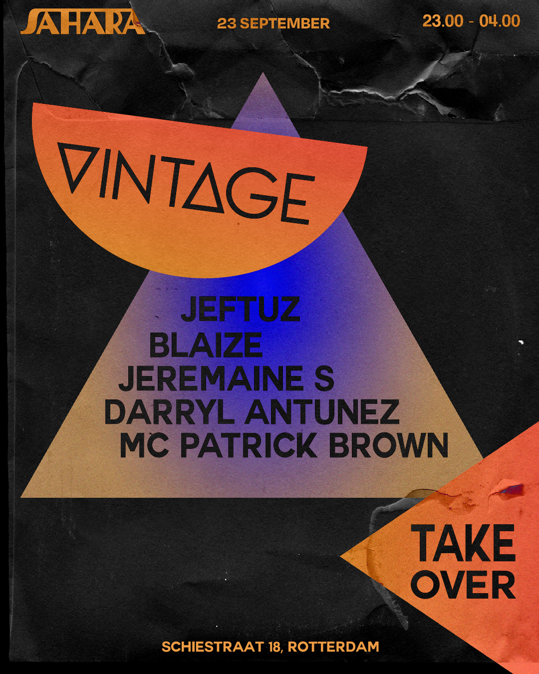 Deze jonge club, gevestigd in de kelder onder het beruchte Schieblock, heeft een warm en authentiek palet dat niet alleen terugkomt in de programmering, maar ook in de branding. Voor individuele evenementen en feesten bij Sahara kreeg ik de vrijheid om deze stijl telkens opnieuw op mijn eigen manier te interpreteren. Dit resulteerde in uiteenlopende, unieke artworks die allemaal de warme sfeer van de dansvloer weerspiegelen.